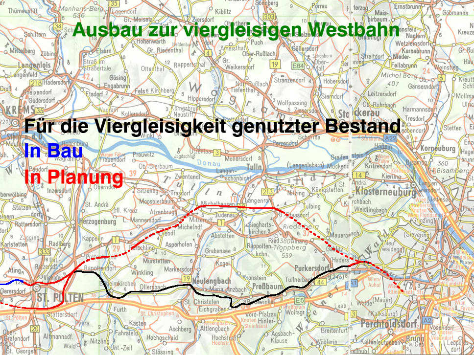 Die Westbahn muß, um die künftigen Kapazitätsanforderungen erfüllen zu können, zu einer viergleisigen Hauptverkehrsstrecke ausgebaut werden. So auch zwischen Wien und St. Pölten. Dadurch wird die Durchgängigkeit der Donauachse gewährleistet, die Westbahn leistungsfähiger und auch für den regionalen Verkehr attraktiver gemacht.